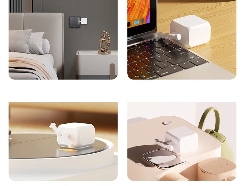 Se adhiere fácilmente a cualquier interruptor o botón y se controla por Bluetooth o WiFi. Compatible con Alexa, Google Home y Siri, te permite automatizar rutinas y ahorrar energía fácilmente.