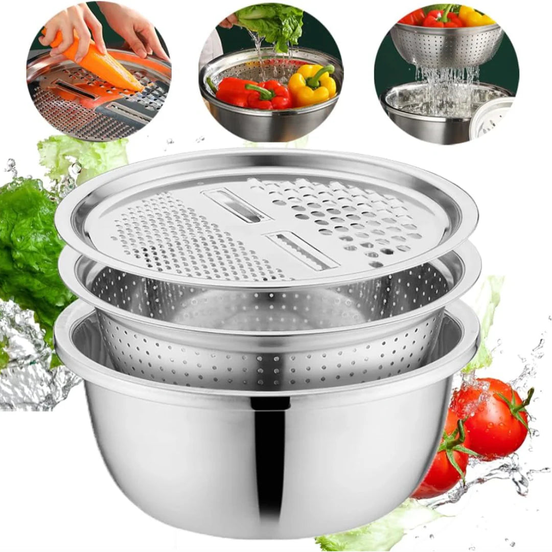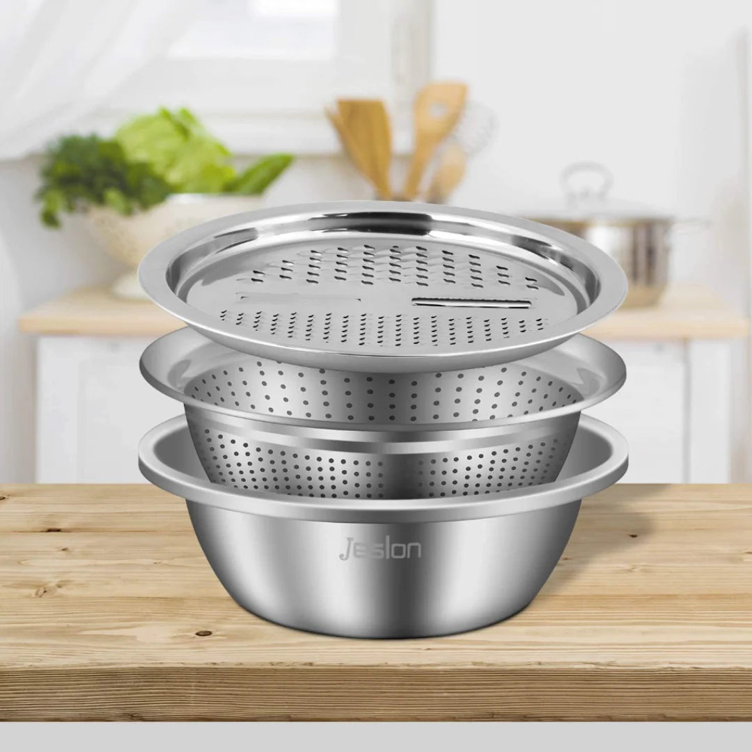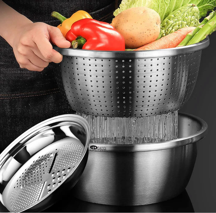 Este cuenco no es solo un recipiente; es un sistema completo de cocina. Incluye cuchillas de acero inoxidable para un rallado rápido y seguro, además de una cesta interna que permite escurrir alimentos sin ensuciar más utensilios.